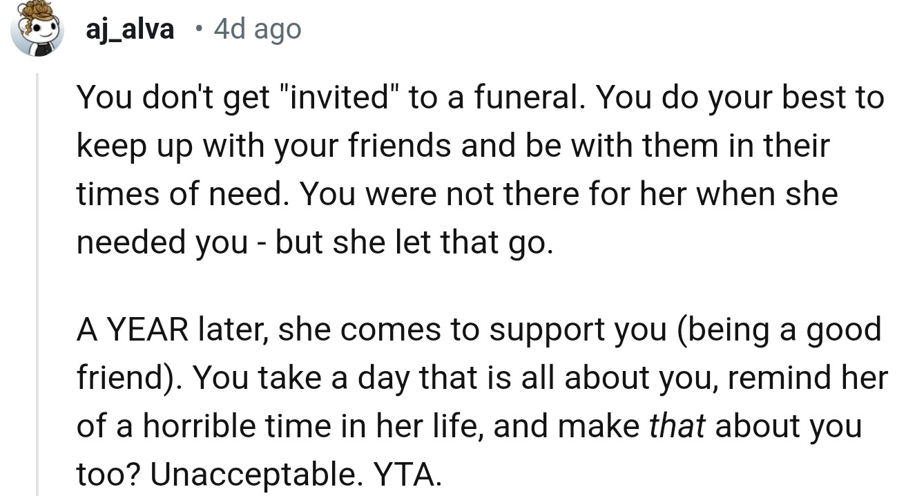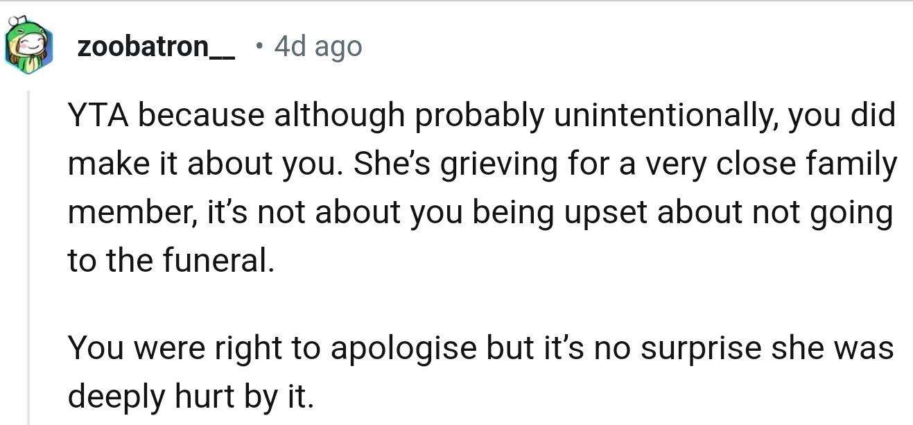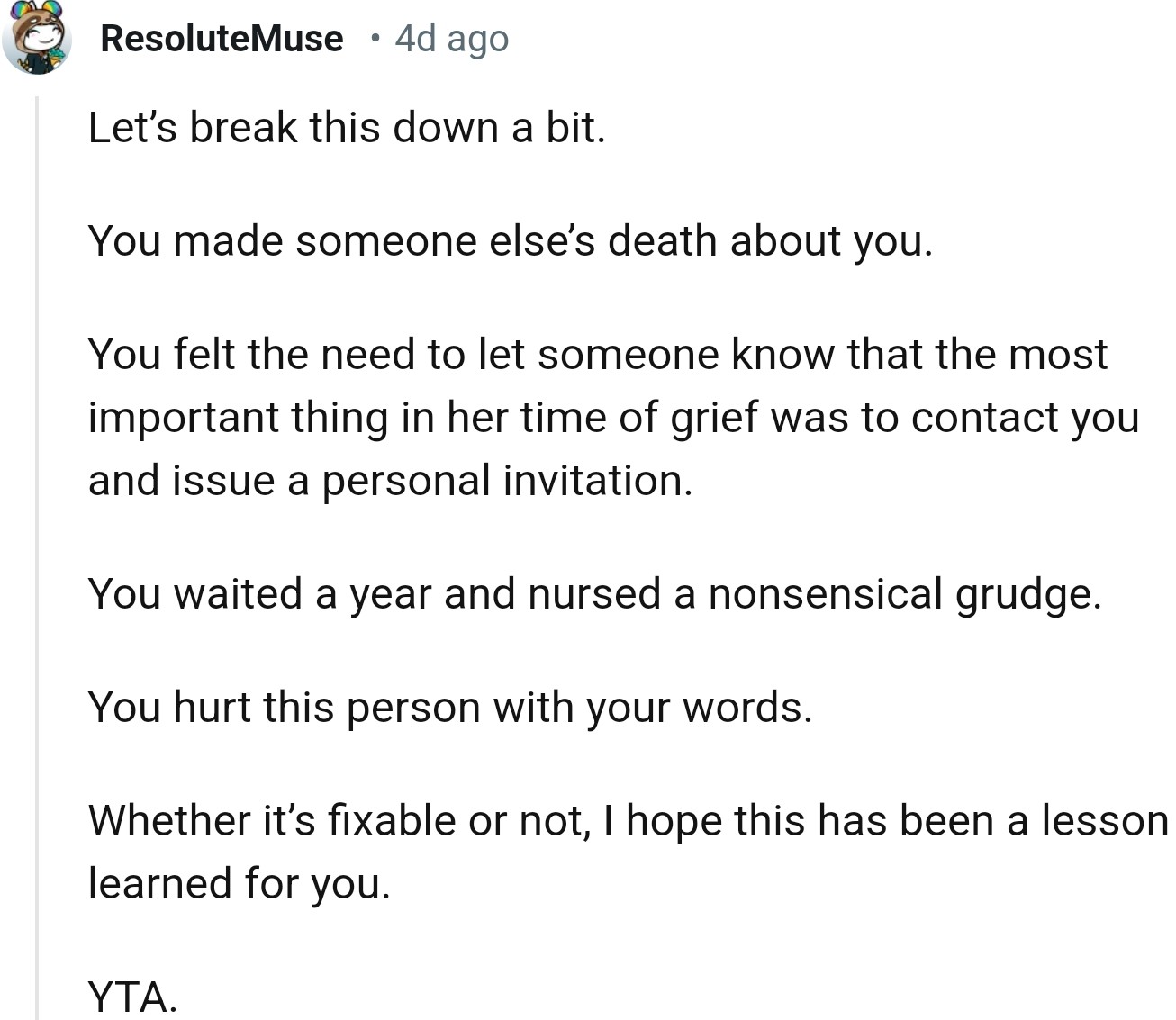 Maggie attended OP’s wedding, and it seemed like all was forgiven. However, a year later, she received an email from Maggie stating that she couldn’t move past the outburst about the funeral.