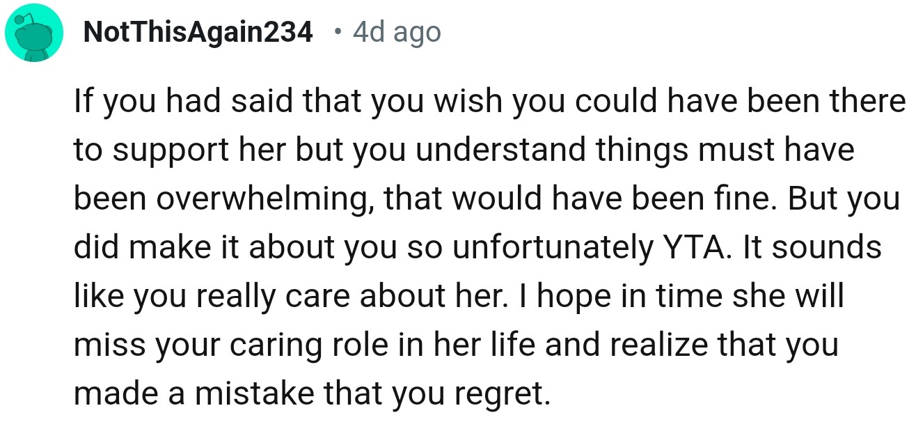 Now, here’s the million-dollar question: was OP being selfish by voicing her hurt?
