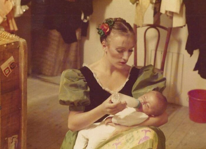 "France, 1985. My Mom Feeding Me Backstage During A Ballet Dancing Show"