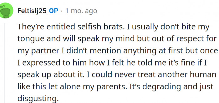 The family consists of three sisters and two brothers, all between the ages of 25 and 35. OP has observed that the way the siblings treat their parents is incredibly degrading and is beginning to drive them insane.