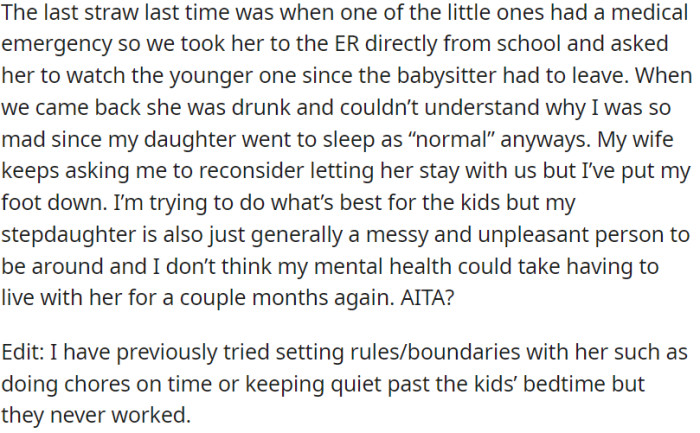 She often has loud friends over, comes home drunk, and ignores household rules. The situation reached a peak when the stepdaughter was supposed to watch a child with a medical issue but was too drunk to help. Despite their wife's urging, OP stands firm on not allowing her to stay due to concerns about the kids and their own mental health. They're wondering if they're making the right decision.