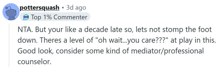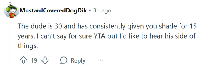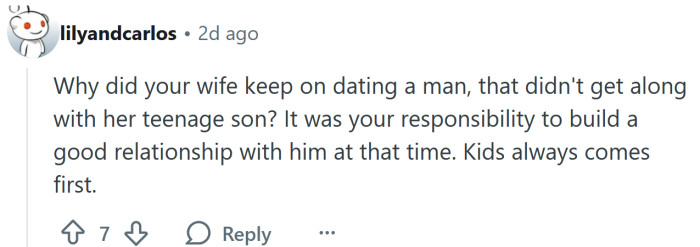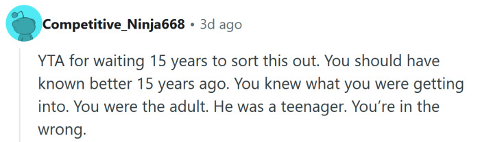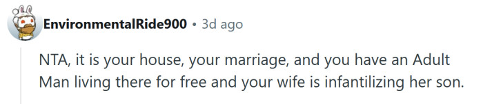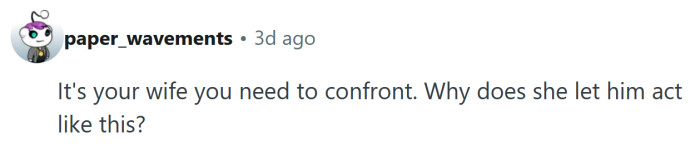 Another added that his wife is enabling her son’s behavior by refusing to confront it. “If she keeps treating him like a child, he’ll keep acting like one,” they said.