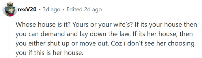 Either way, the man knows something has to change. He’s tired of being the outsider in his own home and is determined to reclaim some peace in his personal life.