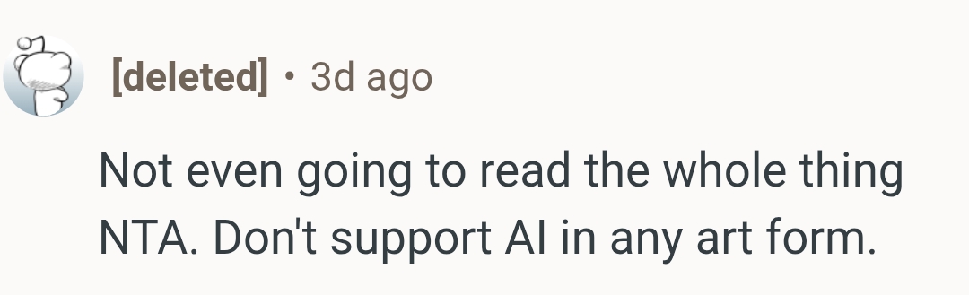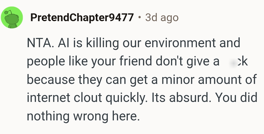 Still, some people actually enjoy AI music, but the OP has every right to not support her friend since she doesn't like what she's doing. The OP was declared not the AH, and you can drop your own verdict in the comments section below.