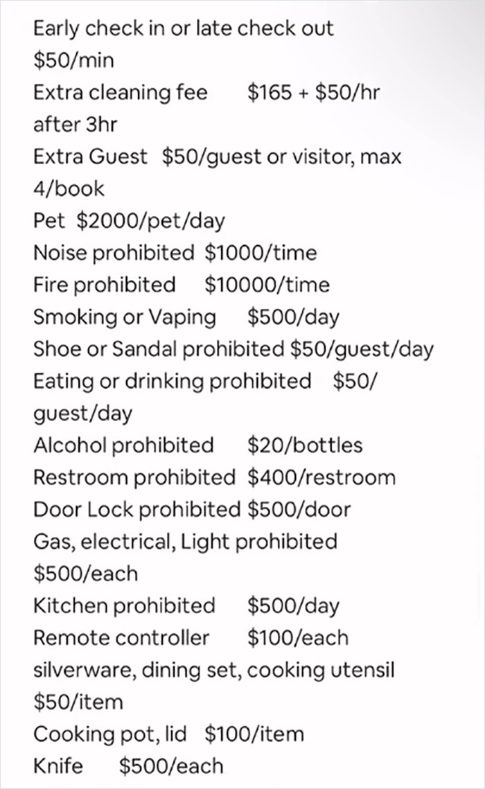 The list included things like being charged $50 a minute for late checkout, costs for wearing shoes in the house, and only being allowed to drink three beers per day.