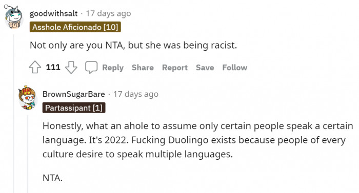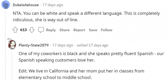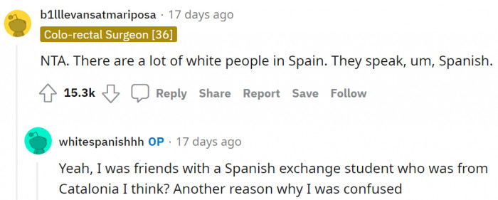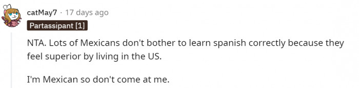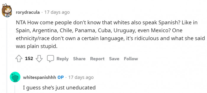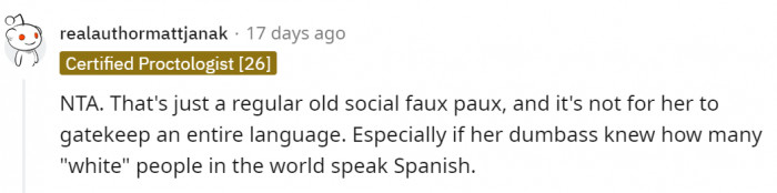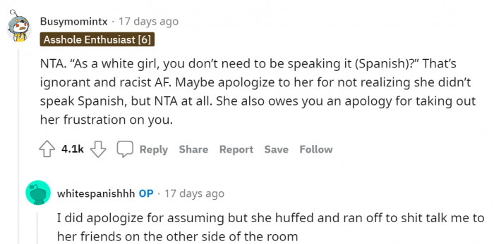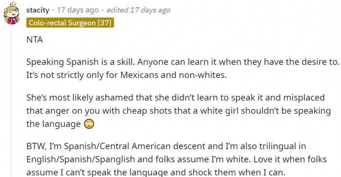 Instead of correcting her, Luisa lashed out, stating that not everyone speaks Spanish. In addition, she mentioned that as a white girl, OP should not be speaking Spanish.