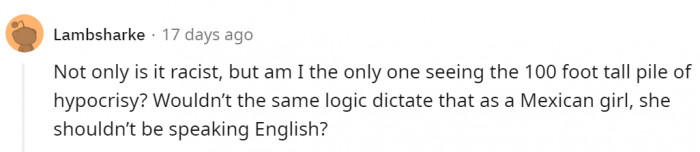 "Wouldn’t the same logic dictate that as a Mexican girl, she shouldn’t be speaking English?"