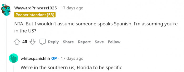 u/whitespanishhh / reddit.comOP explained that she had been used to conversing in Spanish with her brother and his best friend. And so she decided to do the same with his girlfriend, as well