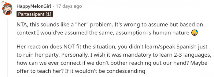 To better understand the situation, OP proceeded to seek clarity from the Reddit community. She also mentioned that she had apologized to Luisa for assuming she spoke Spanish.
