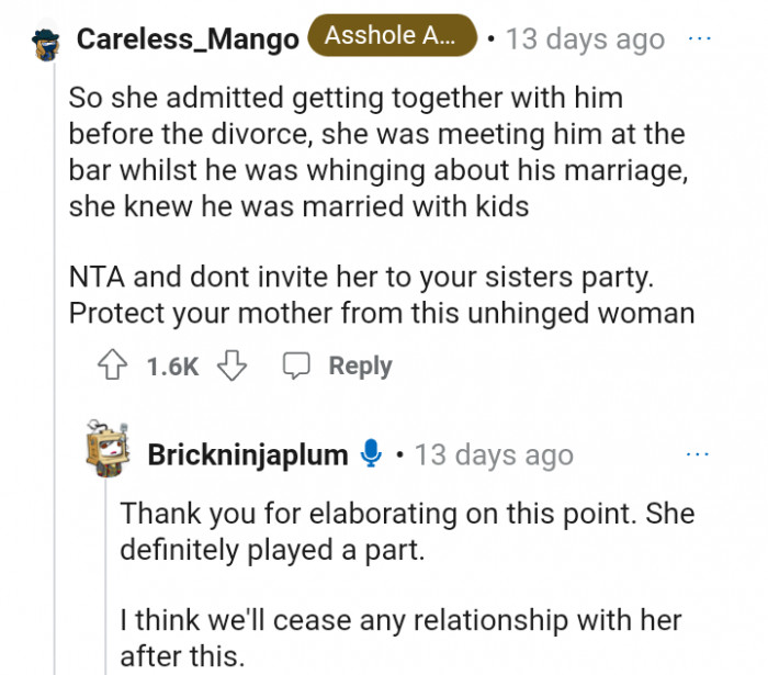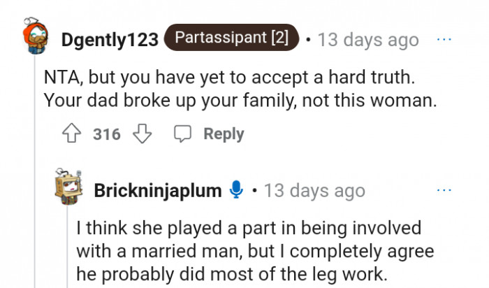 In this Reddit story, the seed of discord was planted after OP’s (original poster) dad found a new partner almost immediately after getting divorced. It was a shock for the entire family, prompting cheating allegations.