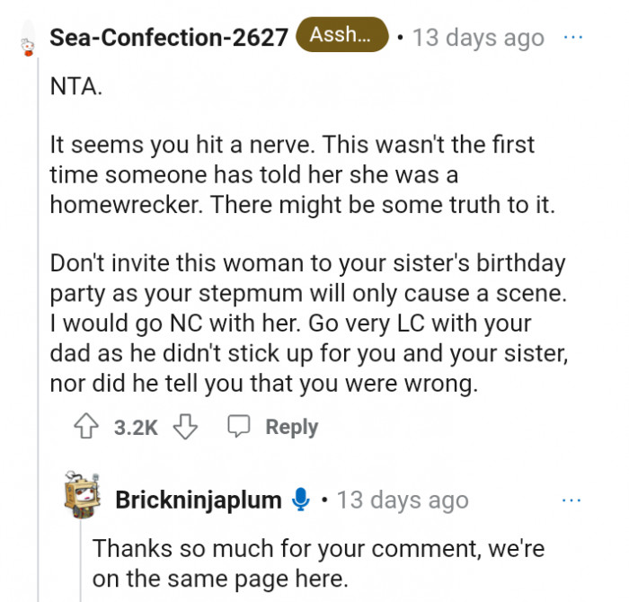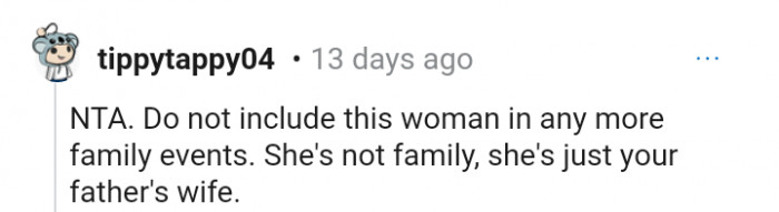 u/Brickninjaplum / reddit.comOP's stepmom also claimed she was mistreated during one of her stepdaughter's weddings (OP's younger sister's wedding)