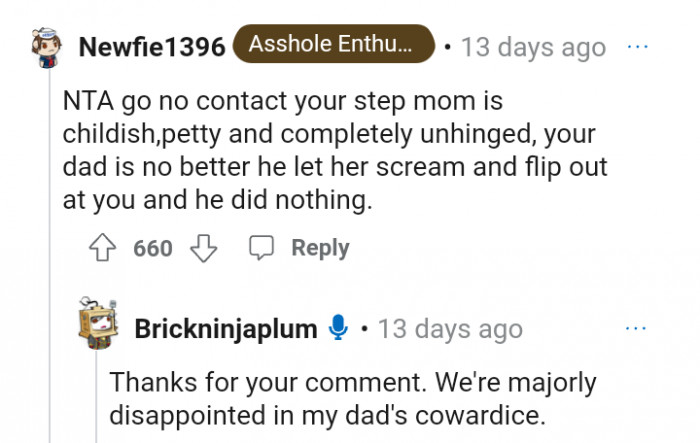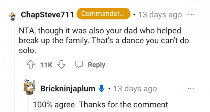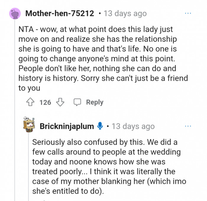 u/Brickninjaplum / reddit.comTurns out OP's mother and grandparents gave her stepmom the silent treatment during the wedding