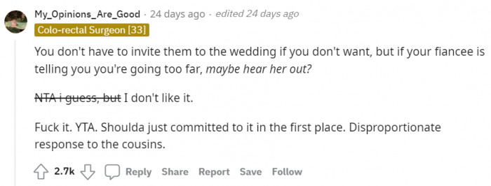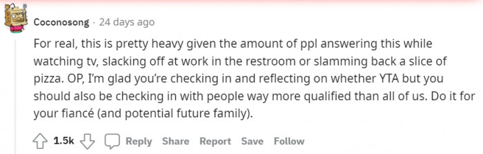 "If your fiancée is telling you you're going too far, maybe you should hear her out?"