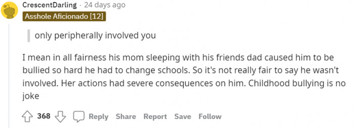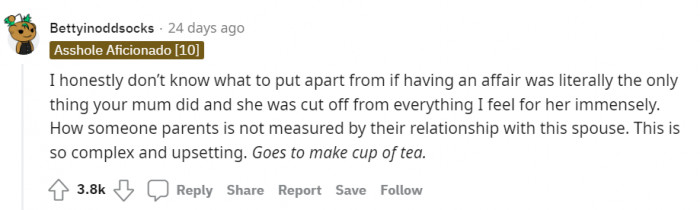In this case, the Redditor explained how his parents divorced when he was 12 due to his mom's infidelity. Her actions caused him so much pain and embarrassment that he decided to take a step back from everything.