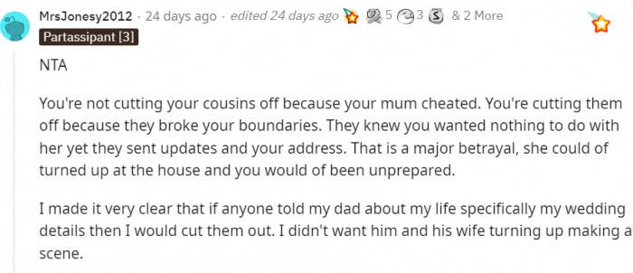"If any of my family members shared my information with that woman, I'd go no contact with them too."