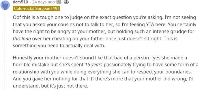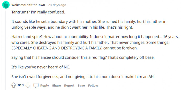 "She isn't owed forgiveness, and not giving it to his mom doesn't make him an AH."