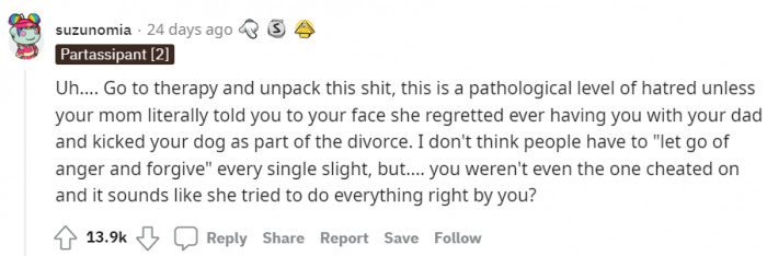 "Honestly, I would encourage you to explore why you feel this hatred for your mom that seems disproportionate."