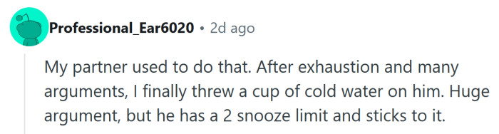He agreed to her ultimatum—kind of. The next day, he set one alarm…and slept through all three rings. He was late for work, got chewed out by his boss, and came home furious.
