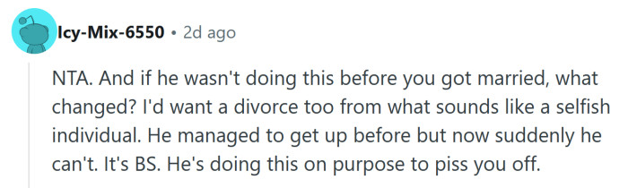 Now he was accusing her of being “unsupportive” for not waking him up. She told him, in no uncertain terms, that she’s his wife, not his mother, and it’s not her responsibility to keep him on schedule.