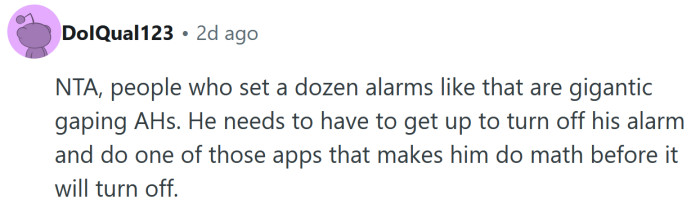 "People who set a dozen alarms like that are gigantic gaping AHs."