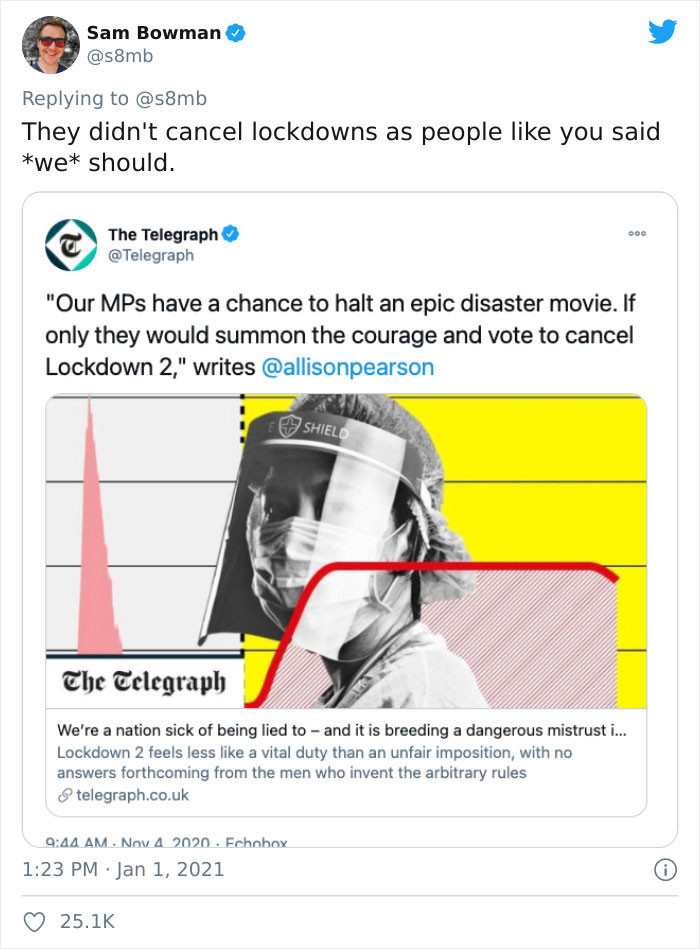 “A lot of people, like Pearson, said very foolish things all year, and they’ve been shown to be catastrophically wrong about Covid. Now that it’s clear how bad things are, we need to highlight what they said and embarrass them so they feel some consequences for having been so wrong in such a reckless and irresponsible way.”