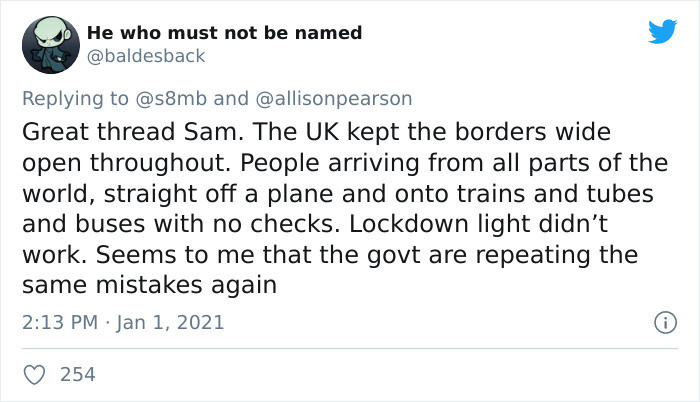 “It didn’t do the bare minimum to prevent Covid from re-emerging when cases were low over the summer and, in fact, actually encouraged people to go out to restaurants and go on foreign holidays over the summer, which ended up increasing case numbers and resulted in people bringing back many cases from abroad. It hasn’t even required foreign visitors to have a negative test to enter the country or mandated that they quarantine upon entering the UK, which means that if new strains do arise abroad, like the South African one, we will be exposed.”