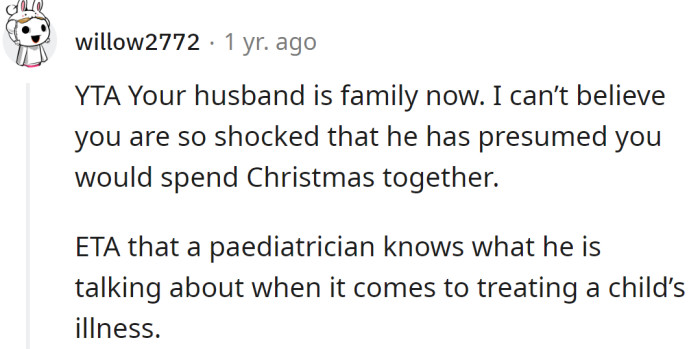 Redditors told the OP that her husband was right to expect to spend Christmas together as a family. He also has the right to be upset with her for allowing her parents to exclude him.