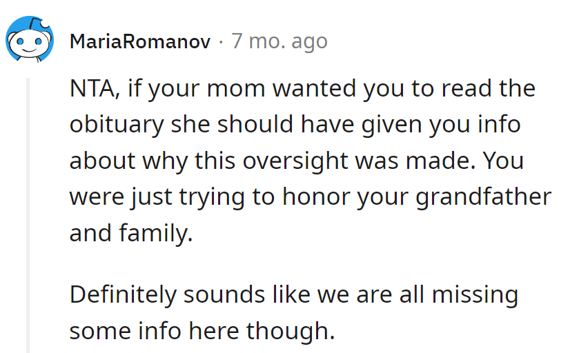In this story, the granddaughter, who had lost her beloved grandpa, faced a heart-wrenching dilemma. The obituary, prepared by her mother and aunts, had conspicuously omitted her step-grandmother’s side of the family.