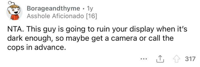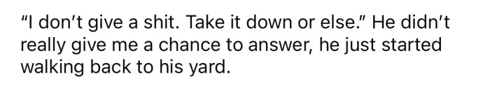 But the OP's neighbor wasn't having it. "I don’t give a shit. Take it down or else," he said before stomping back to his yard.