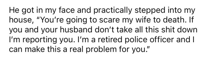 He got in the OP's face and screamed at her, "You're going to scare my wife to death. If you and your husband don't take all this shit down, I'm reporting you; I'm a retired police officer, and I can make this a real problem for you."