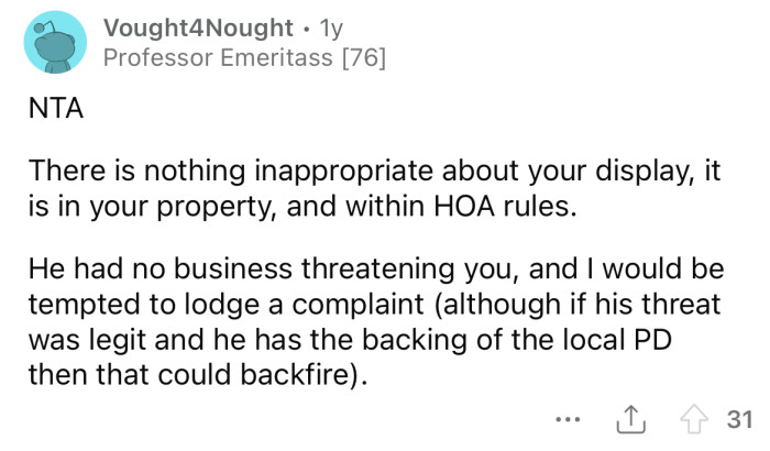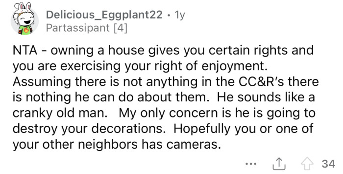 What's your take on this situation? Do you think the OP should have taken down the decorations, or was her neighbor entirely out of line and overreacting for attacking her the way he did?