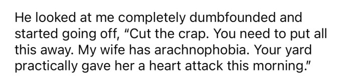 "My wife has arachnophobia. Your yard practically gave her a heart attack this morning," he continued.