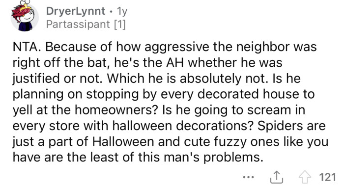 The OP made the mistake of laughing at that comment and told him she didn't think their pretend spider would even scare a small child. She asked the neighbor if he was pulling her leg, and that didn't go over well.