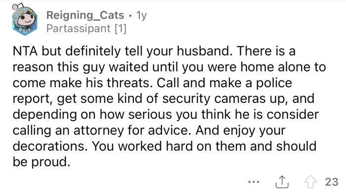 The Redditor was stunned and confused, so she asked if he was upset because of the decorations. The neighbor looked astonished and screamed, "Cut the crap; you need to put all this away!"