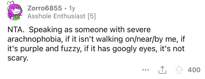 The OP made the mistake of laughing at that comment and told him she didn't think their pretend spider would even scare a small child.