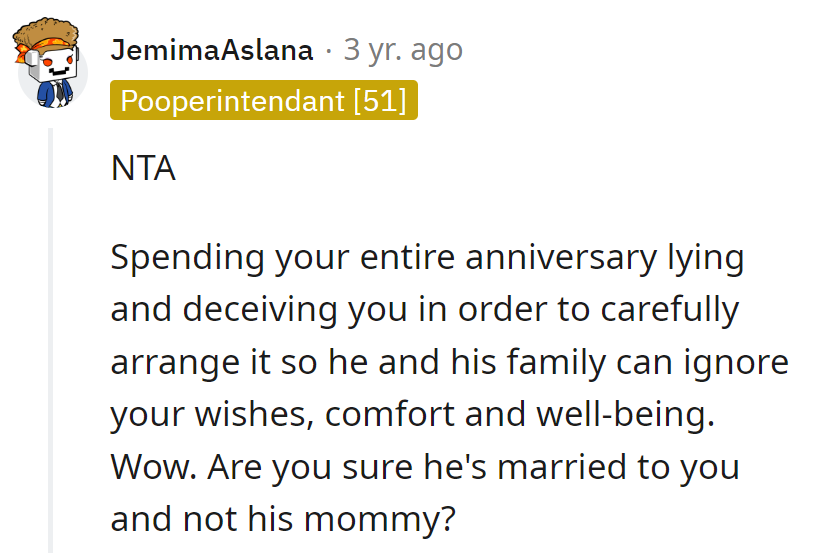 RedditHusband suggested celebrating the anniversary at his mom's with family, but OP, already having plans, firmly declined.