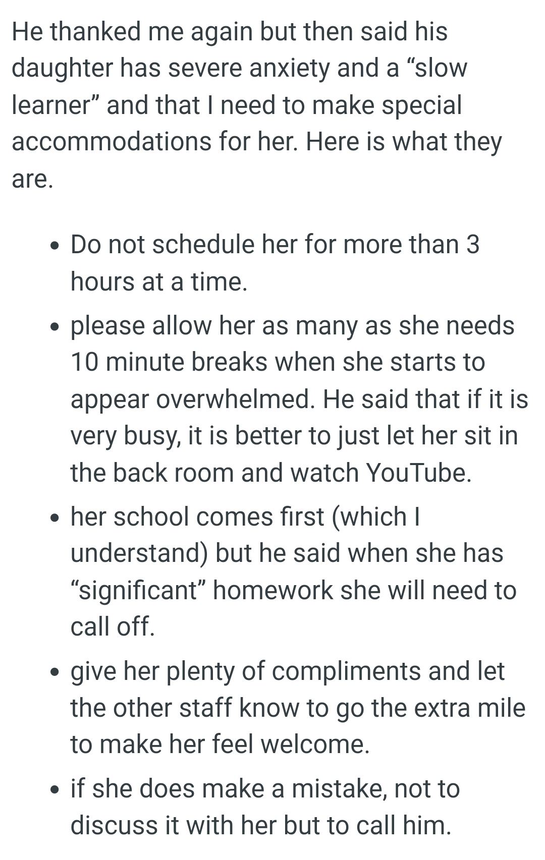The OP understood this, which is why he was reluctant to abide by one of his employee's rules. Actually, this employee's dad provided the rules to the OP because his daughter has severe anxiety and is a slow learner.