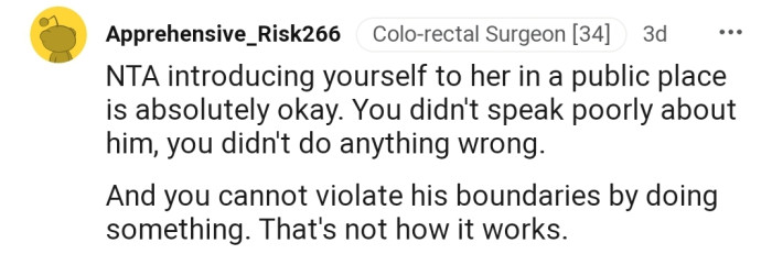 "All you did was introduce yourself. What boundaries does he have that you crossed?"