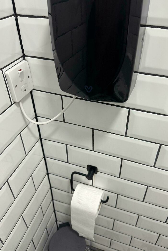 "I Hope You Appreciate Your Paper Towel Airborne! Someone Installed A High Velocity Hand Dryer Right Above The Garbage Bin."