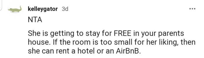 "If the room is too small for her liking, then she can rent a hotel or an Airbnb."