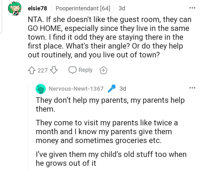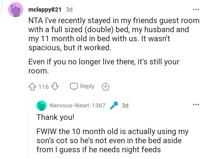 OP explained that her cousin's family had come to stay at the house because her dad was sick. While they made use of the guest room, OP was cuddled up with her toddler in her cozy bedroom.