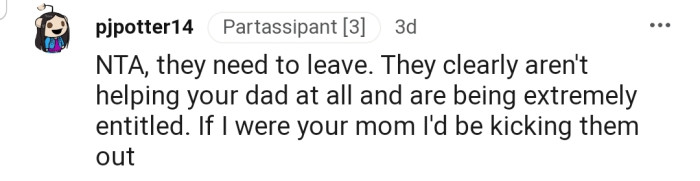 "They clearly aren't helping your dad at all and are being extremely entitled."