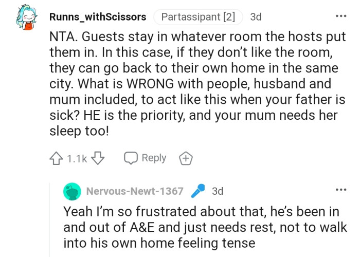 "NTA. Guests stay in whatever room the hosts put them in."