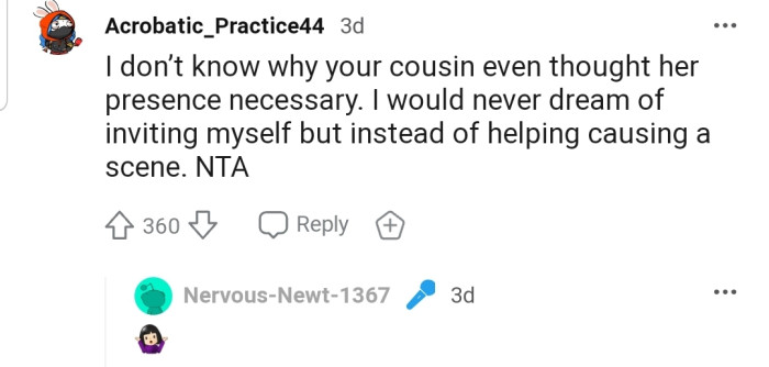 "I don’t know why your cousin even thought her presence was necessary."