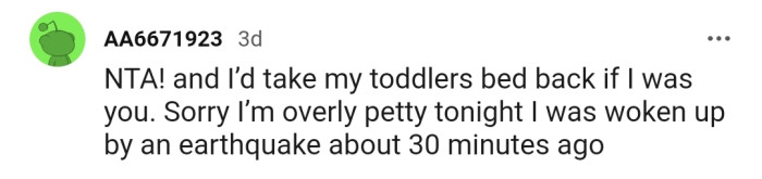 "NTA! And I’d take my toddler's bed back if I were you."