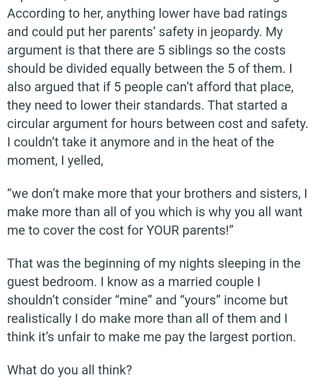 1. I refuse to pay our fair share for my wife’s assisted living apartment on principle.2. I make more than my wife and her siblings, and the cost won’t affect me that much. Also, she said it’ll affect their safety.The Reddit post went viral with thousands of comments, and here are a few of the most upvoted ones