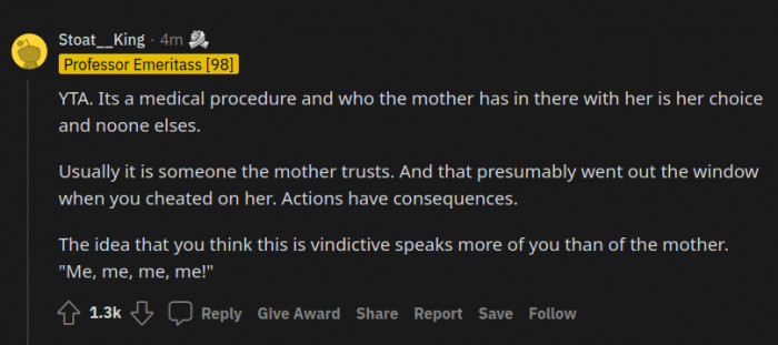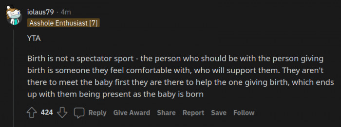 u/throwaway_6030At a glance, without the info, most people would agree that dads should be allowed in the delivery room. However, OP is a piece of work.