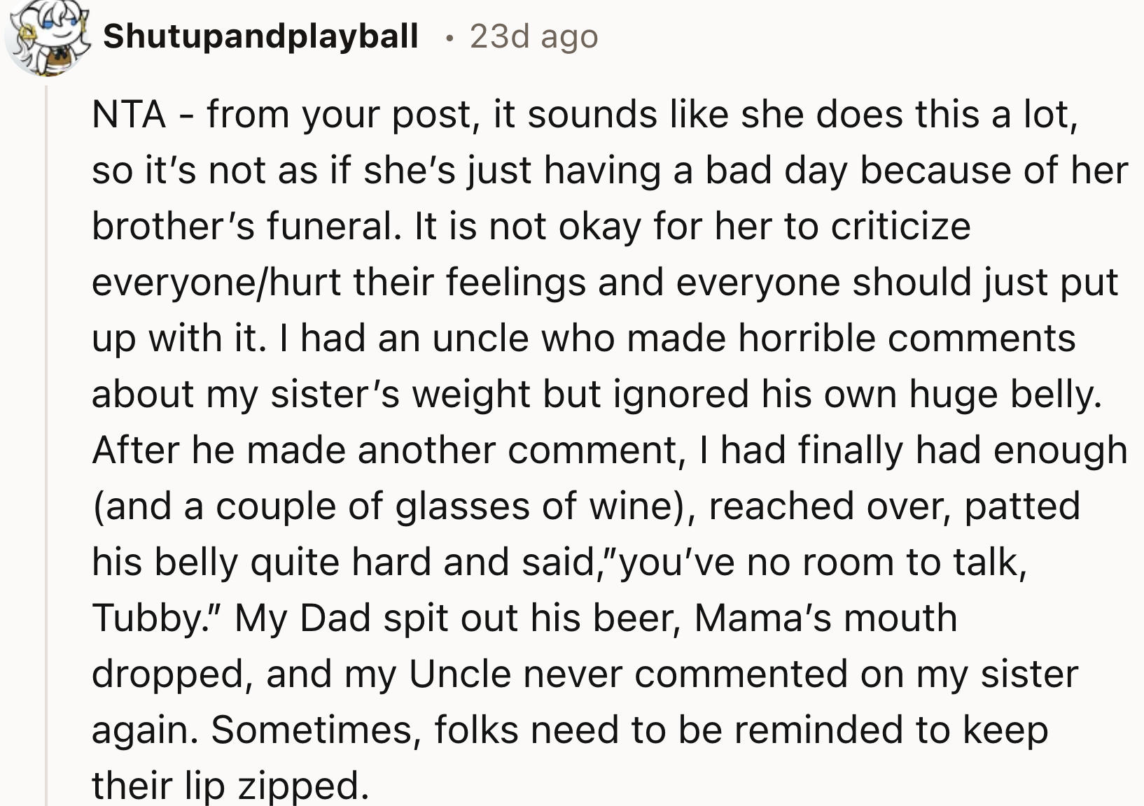 In the intricate web of family dynamics, there are often moments that test our patience and challenge our boundaries. One such instance unfolded for OP (21F) at a funeral, where her aunt's insensitive remarks reached a boiling point.