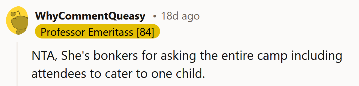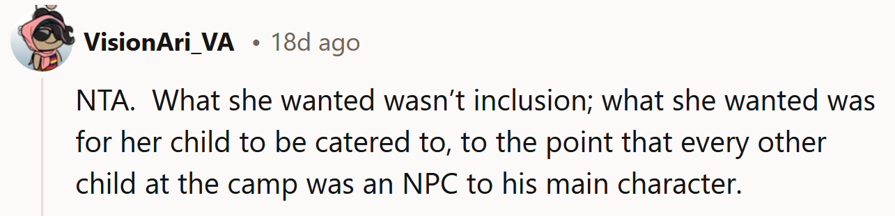 This suggests that the Redditor's reluctance to adjust the sports camp's activities may overlook the importance of inclusivity for all children.