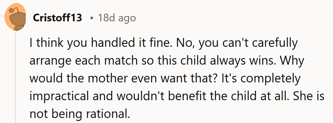 So, Sara asked the OP to make sure that Connor never lost a game and that she let him win in every sport. The Redditor told Sara that she couldn't do that and that it would be unfair to the other children if she did.